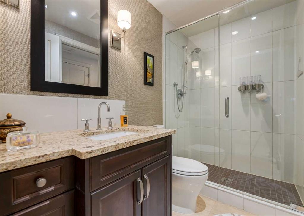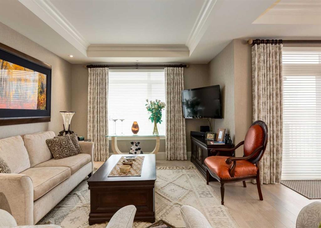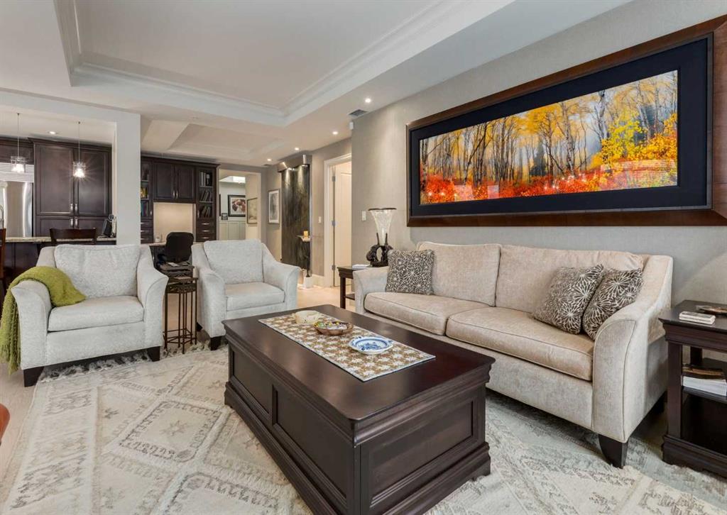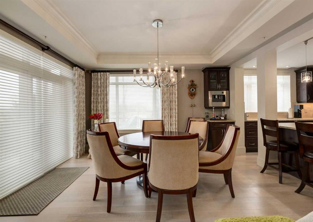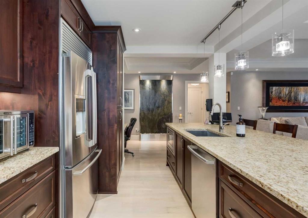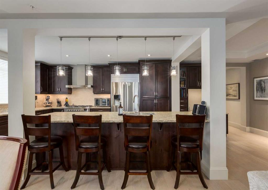 Coveted, Spectacular Corner Unit location on the main floor! Unobstructed views of the Bow River and parkland, with lots of opportunity to ride your bike, walk and enjoy the outdoors and wildlife that wander close by for your enjoyment. You will love the fabulous decor. Kitchen with plumbed-in coffee maker, gas stove, dishwasher, fridge, hood fan, microwave. Espresso color cabinetry and leathered granite countertops. Beautiful island overlooking dining and living rooms with an amazing view of the extensive ...
