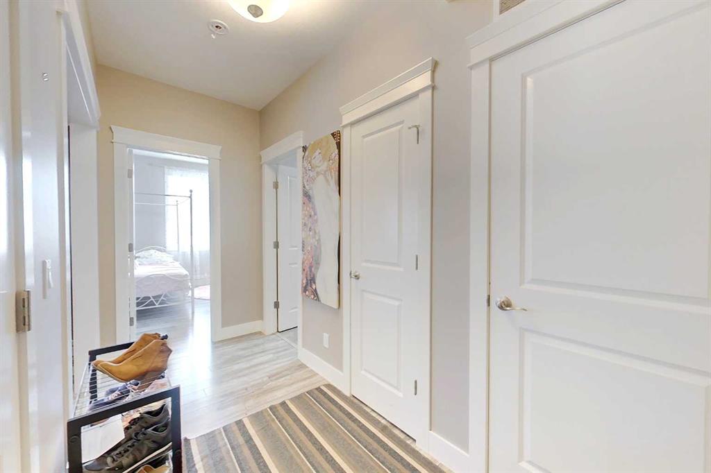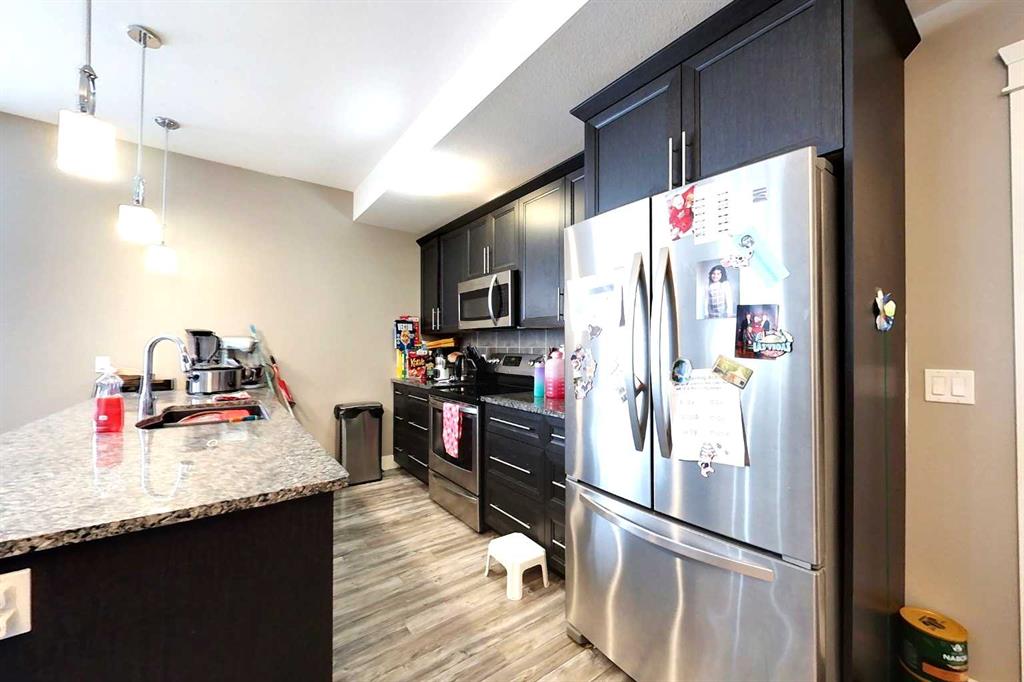 Comfort living at its finest, main level executive style, modern condo available. Great location! Next to a convenience store and Deli, walking trails, dog park, park, & schools . Open concept kitchen with granite counters, dark cabinetry, island with large sink, modern lighting. Unit is north and west facing with plenty of natural light coming in. Living area has a beautiful gas fireplace. 2 large bedrooms; primary bedroom has a large walk in closet and 4 piece ensuite bathroom. Main bath is also four pi...