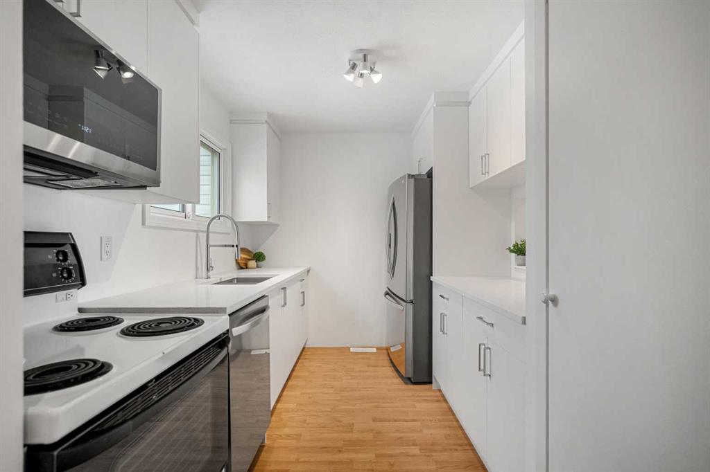 This updated 3-bedroom end-unit townhouse is ideally located on a quiet street and offers the convenience of a parking stall directly outside the front door, along with a fully fenced backyard that backs onto a community green space with access to a variety of neighbourhood amenities. The main floor boasts durable laminate flooring throughout and a newly renovated galley-style kitchen with bright white cabinetry, stone countertops, an undermount sink, pantry storage, and a convenient peek-a-boo opening to ...