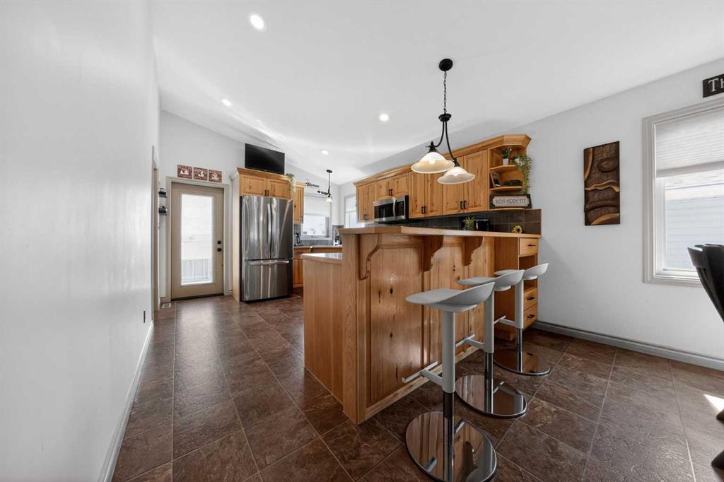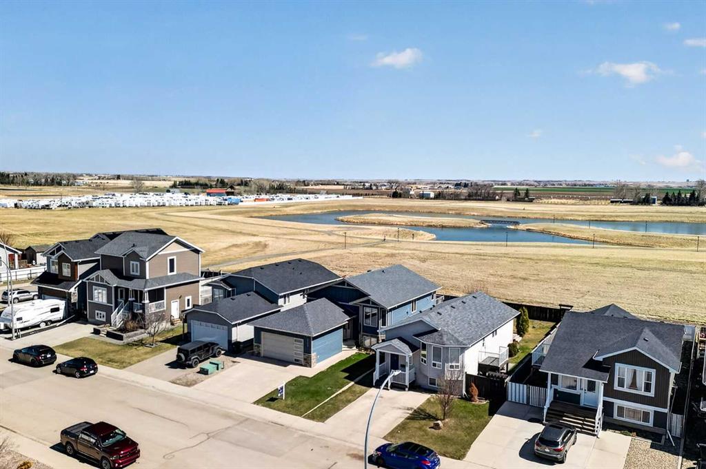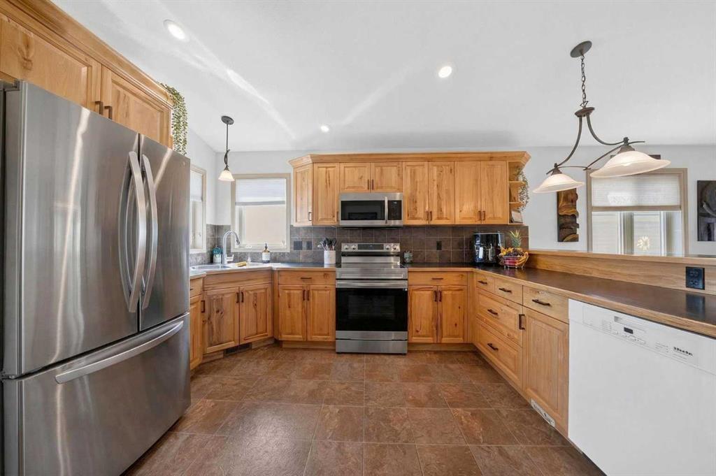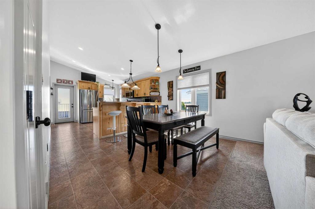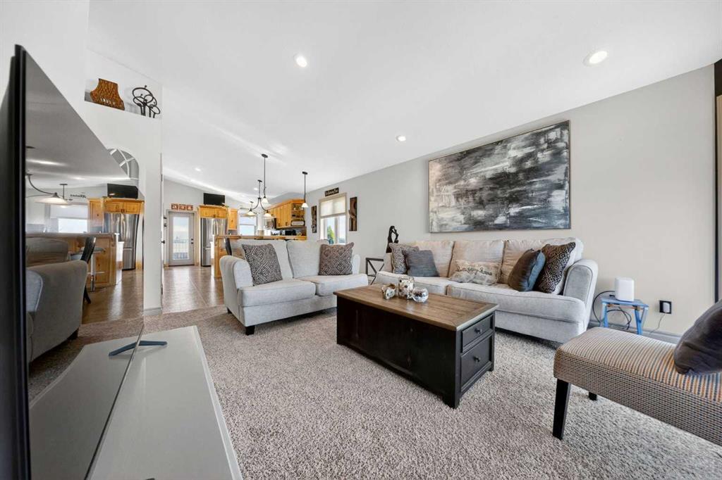 Well kept bi-level in Coalhurst with 6 BEDROOMS, 3 BATHROOMS, & an illegal basement suite backing field, park, and pond. Nice hardiboard plank exterior. Beyond Entry is walled off to upper and lower levels. Entry also has door to garage. Main floor features open plan with vaulted ceilings for living, dining, kitchen. Living room has nice windows for plenty of light. Dining space is a good size. Kitchen features wood cabinets with raised breakfast bar, new fridge and stove stainless steel appliances in 2025,...